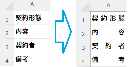 [セルの書式設定]→[配置]→「横位置」で「均等割り付け(インデント)」を選択します。