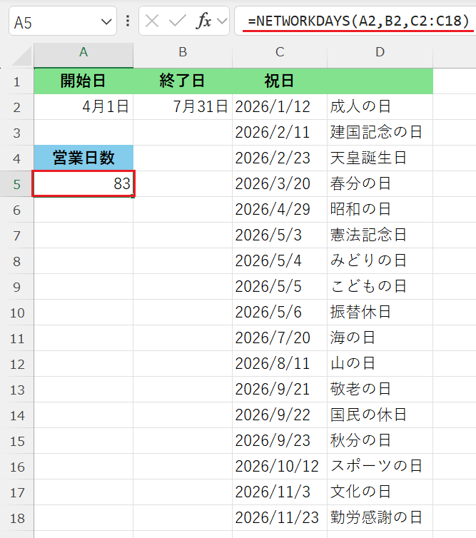 祝日も除外する場合は、NETWORKDAYS関数と同様に祝日リストを指定します。