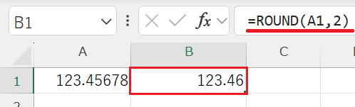 =ROUND(A1,2)→ 小数点以下2桁に四捨五入=ROUNDUP(A1,2)→ 常に切り上げ=ROUNDDOWN(A1,2)→ 常に切り捨て