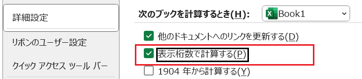 - 「ファイル」>「オプション」>「詳細設定」から「表示桁数で計算する」チェックボックスをオンにします。