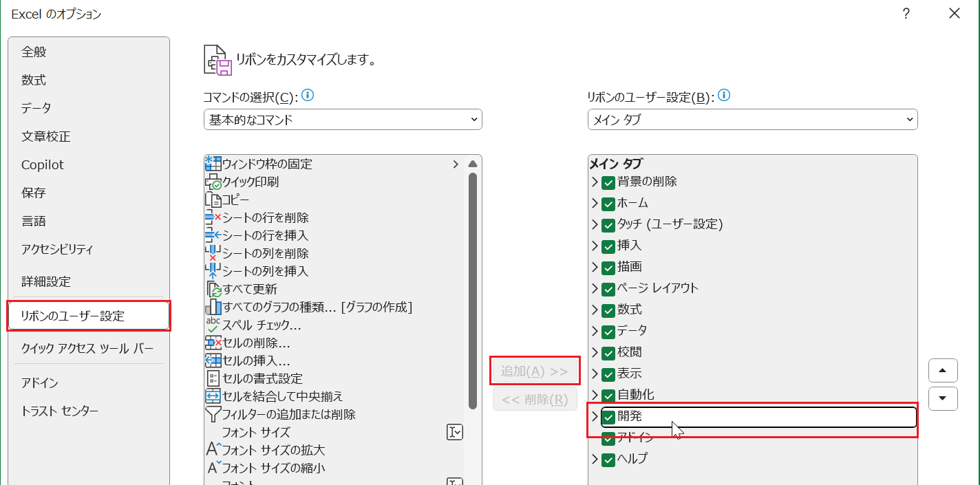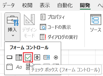 [ファイル] → [オプション] → [リボンのユーザー設定] → 「開発」にチェックを入れて表示します。 - チェックボックスを挿入する